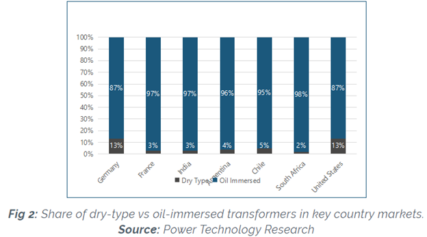據(jù)PTR統(tǒng)計(jì),從全球來看,92%的配電變壓器(按單位計(jì)算)是油浸變壓器,干式變壓器只占8%。世界主要國(guó)家的干式變壓器占有以下市場(chǎng)份額:德國(guó)13%,法國(guó)3%,印度3%,阿根廷4%,智利5%,南非2%,美國(guó)13%。