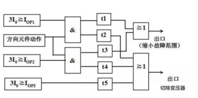 直接接地電壓為110kV及以上中性點的變壓器,應在大電流接地系統(tǒng)側設置零序電流保護。變壓器側直接接地的變壓器,零序電流保護應帶方向,方向應指向各側母線。零序電流保護的原理與線路零序保護相似,可參考第30期。零序電流可取自中性點CT二次電流或本側CT二次三相電流。接入方向元件的零序電壓可取自本側PT開口的三角電壓或本側的二次三相電壓。微機保護裝置主要采用自產(chǎn)方式。對于大型三繞組變壓器,零序電流保護可采用三段式。I段II段帶方向,II段無方向。每段一般有兩級延遲,以較短的延遲縮小故障范圍(跳母聯(lián)或條本側開關),以較長的延遲切除變壓器(跳三側開關)。根據(jù)實際情況確定具體的保護配置。如圖所示,在零序方向電流保護I段或II段后,首先通過短延時t1或t3跳母聯(lián)或跳本側開關,以縮小故障影響范圍。如果故障量仍然存在,則通過長延時t2或t4跳三側開關切斷變壓器。無方向的III段直接通過延遲切除變壓器。