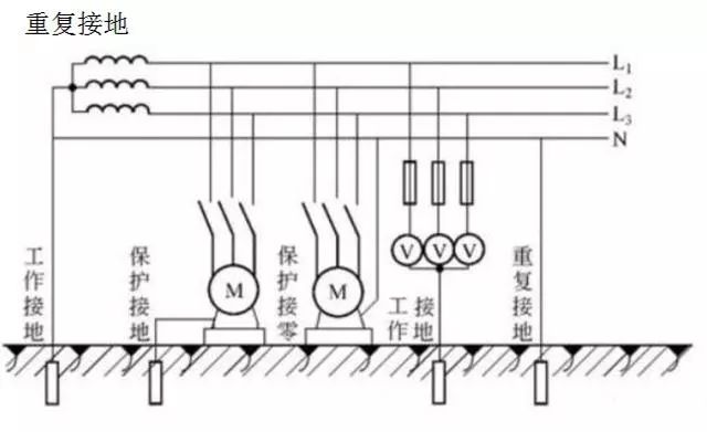 ③中性線必須重復(fù)接地,因?yàn)楫?dāng)中性線斷開時(shí),接零設(shè)備外殼上有220V對(duì)地電壓,這是絕對(duì)不允許的。