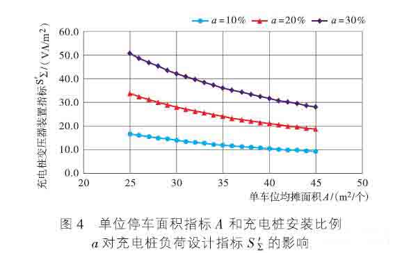 在調(diào)查所有大型商業(yè)地產(chǎn)集團的設(shè)計指引中發(fā)現(xiàn),單個車位的平攤面積均在25~45m2之間。下表所示平均停車面積:25~45m2,充電樁安裝率:10%~30%時,同一種類型、不同充電樁數(shù)對車庫變壓器容量設(shè)計指標的影響如下。單機停車面積指標A、裝樁率a對充電樁負荷設(shè)計指標的影響見下圖: